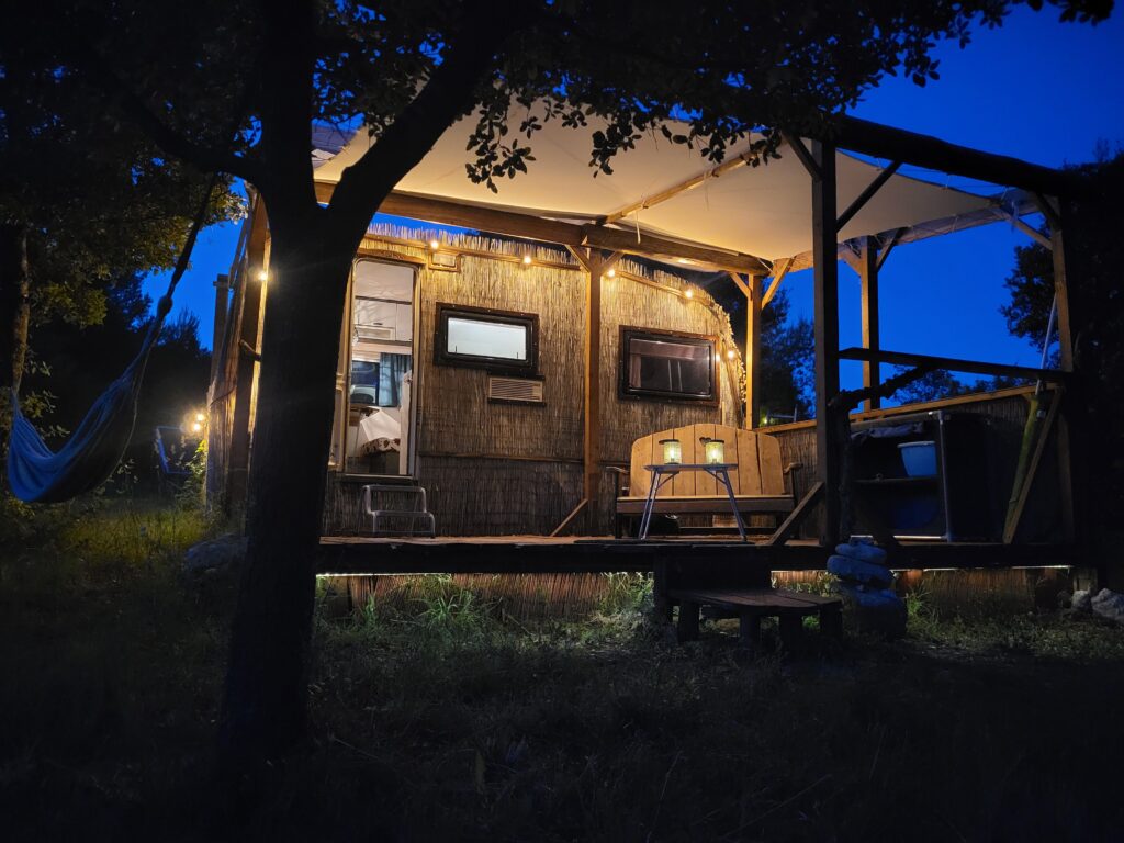 Our caravan offers a cozy and comfortable space, cleverly arranged to make the most of every inch. In the back is a double bed, shielded by sliding doors for added privacy. The kitchen is fully equipped with a refrigerator and all necessary utensils. The lounge area converts into a single bed, ideal for an extra guest or child.